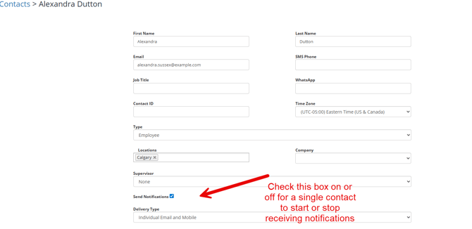 *Important to note that you can turn off notifications for a contact by editing the contact and de-selecting the Send Notifications box - however that will turn off receiving notifications for any expiration items specifically assign to that contact. If this contact still is using Watched Expirations, they will still receive notifications for anything they are watching.