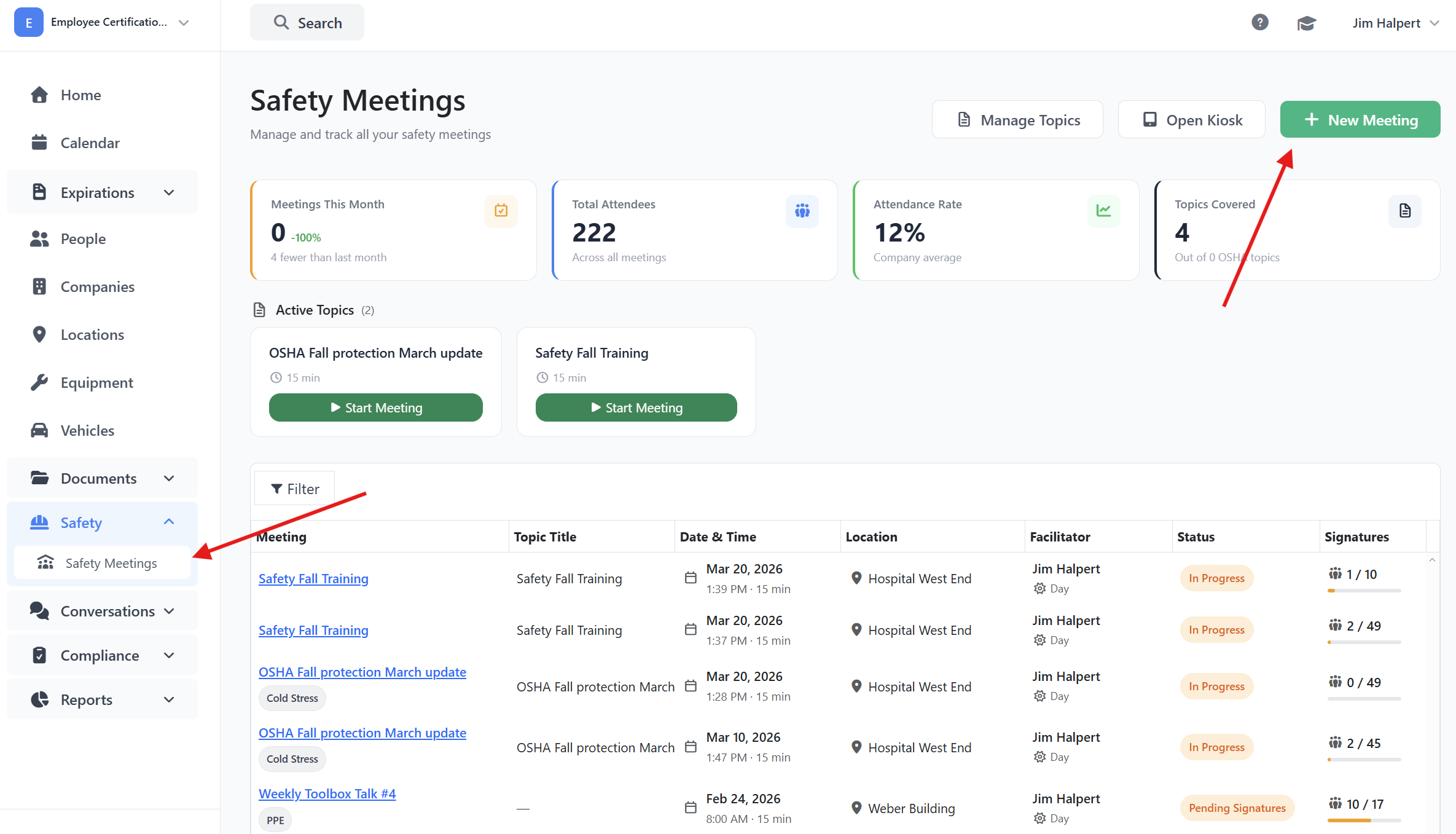 - Track completion and compliance — See at a glance which meetings are complete, which employees have signed, and who still needs to sign.