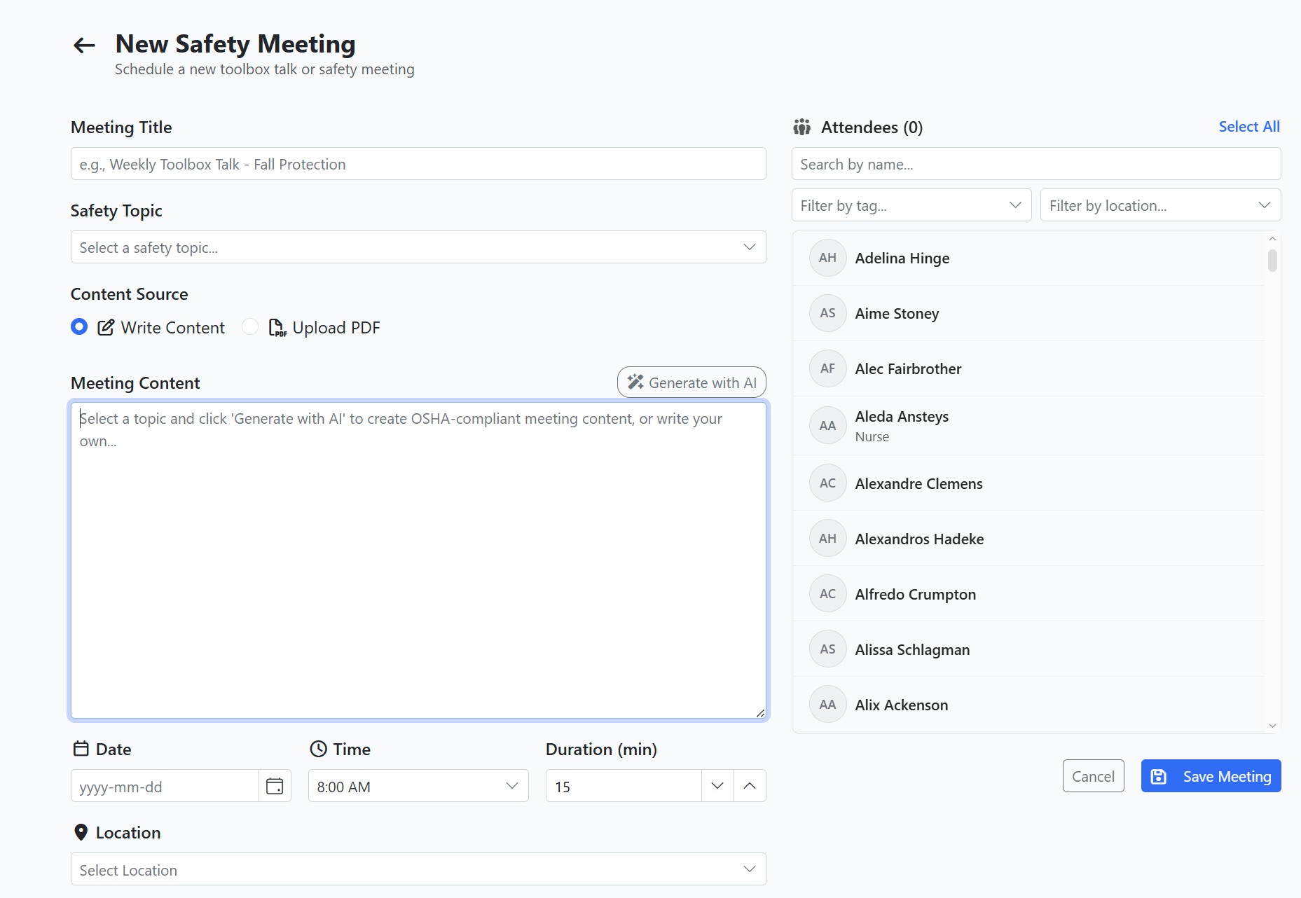 - AI-Generated — Let AI generate OSHA-compliant meeting content based on your selected topic.