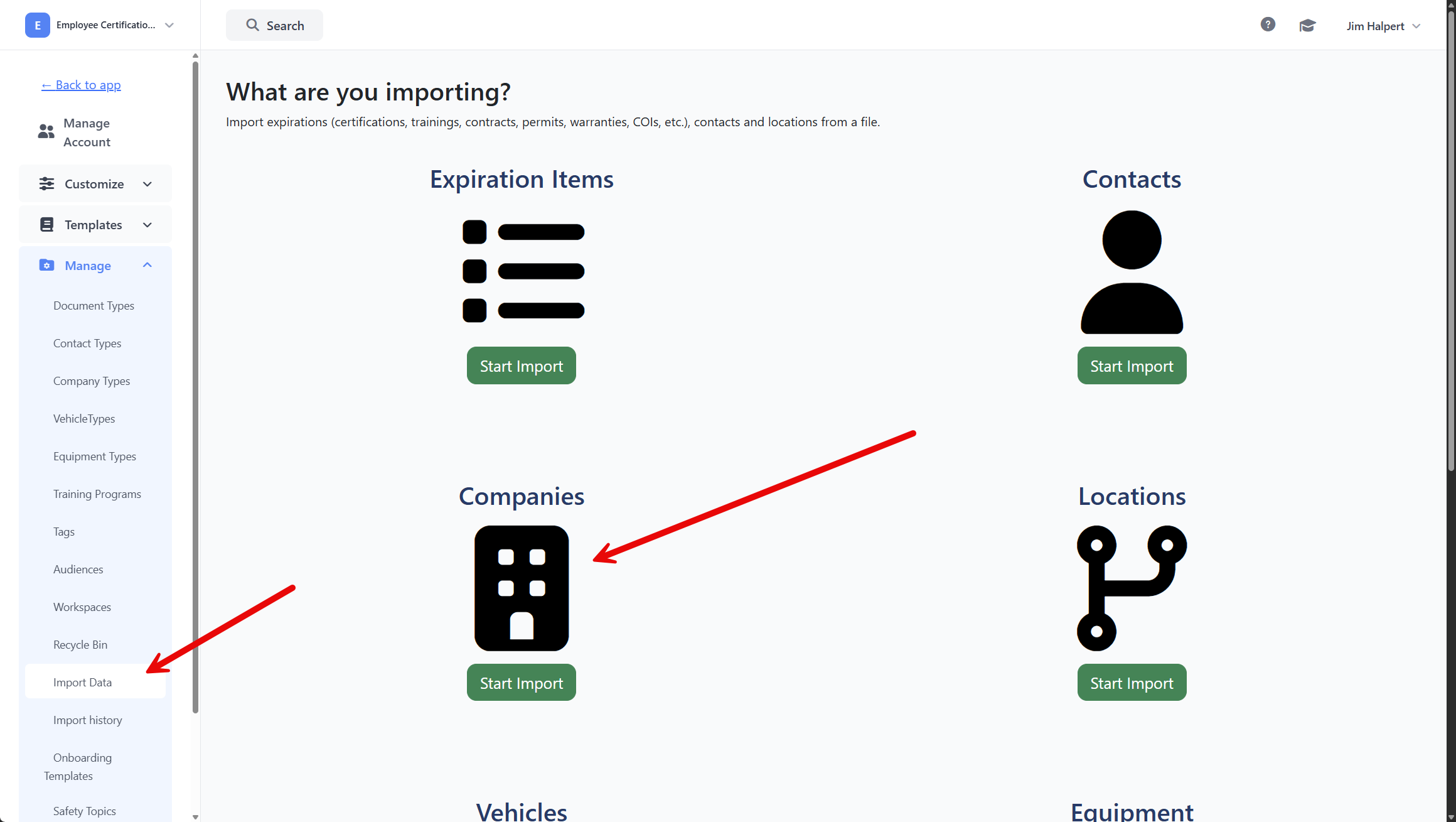 - Click the "Start Import" button under Companies to begin.