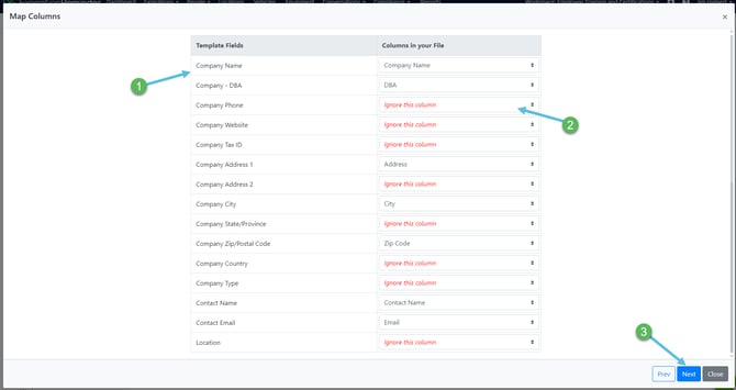 - On the Mapping Columns screen, you'll match the columns from your spreadsheet to the corresponding fields in your account.